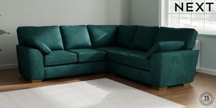 7.2.10 Buy Stamford Medium Corner Sofa - Universal Plush Chenille Dark Teal Green Large Square Angle - Brushed Brass from the Next UK online shop Click here to use our accessible website