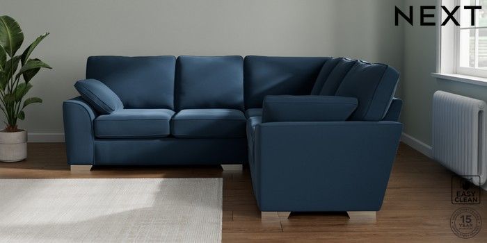 7.2.10 Buy Stamford Medium Corner Sofa - Universal Plush Velvet Easy Clean Airforce Blue Large Square Angle - Chrome Metal from the Next UK online shop Click here to use our accessible website