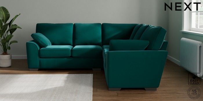 7.2.10 Buy Stamford Medium Corner Sofa - Universal Plush Velvet Easy Clean Juniper Green Large Square Angle - Gunmetal from the Next UK online shop Click here to use our accessible website