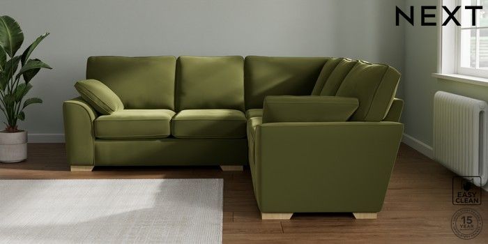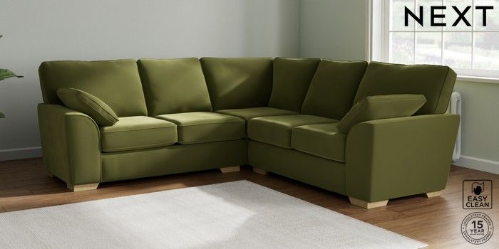 7.2.10 Buy Stamford Medium Corner Sofa - Universal Plush Velvet Easy Clean Mid Olive Green Large Square Angle - Light from the Next UK online shop Click here to use our accessible website