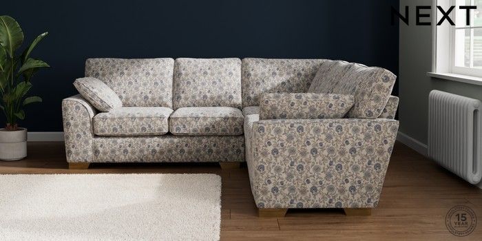 7.3.1 Buy Stamford Medium Corner Sofa - Universal Relaxed Linen Look Print Woodblock Floral Blue Large Square Angle - Brushed Brass from the Next UK online shop Click here to use our accessible website