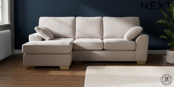 7.2.10 Buy Stamford Medium Sofa Chaise - Left Hand Cotswold Chenille Oyster Large Square Angle - Brushed Brass from the Next UK online shop Click here to use our accessible website