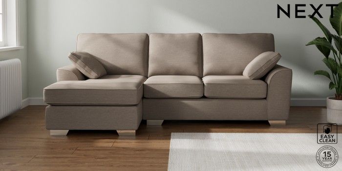 7.3.1 Buy Stamford Medium Sofa Chaise - Left Hand Fine Chenille Easy Clean Mid Taupe Brown Large Square Angle - Chrome Metal from the Next UK online shop Click here to use our accessible website