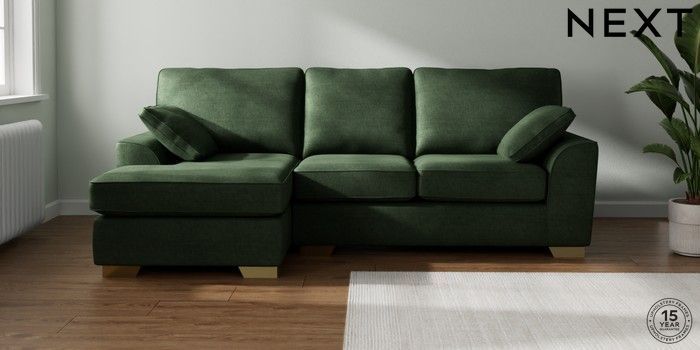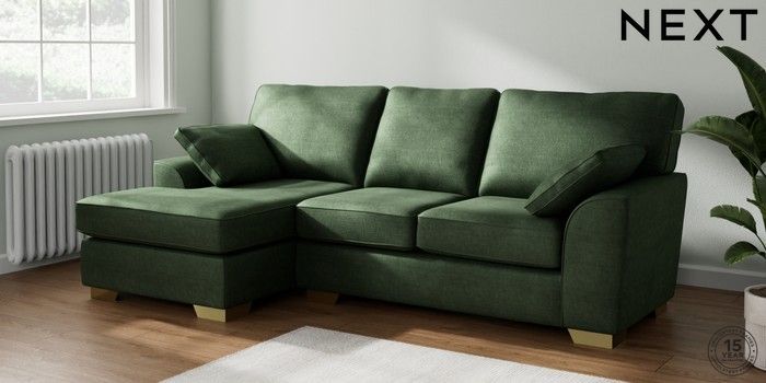 7.2.10 Buy Stamford Medium Sofa Chaise - Left Hand Luxe Chenille Dark Green Large Square Angle - Brushed Brass from the Next UK online shop Click here to use our accessible website