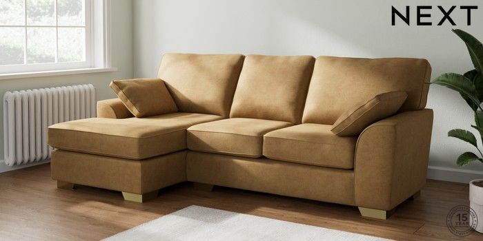 7.2.6 Buy Stamford Medium Sofa Chaise - Left Hand Luxe Chenille Honey Yellow Large Square Angle - Brushed Brass from the Next UK online shop Click here to use our accessible website