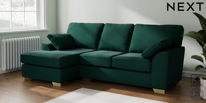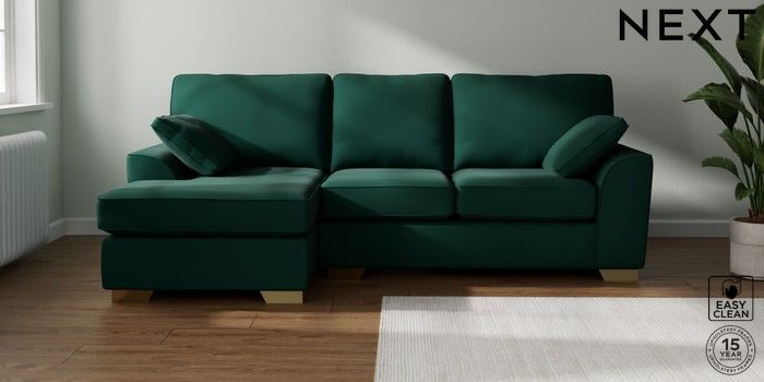 7.2.10 Buy Stamford Medium Sofa Chaise - Left Hand Plush Velvet Easy Clean Bottle Green Large Square Angle - Brushed Brass from the Next UK online shop Click here to use our accessible website