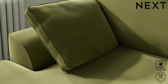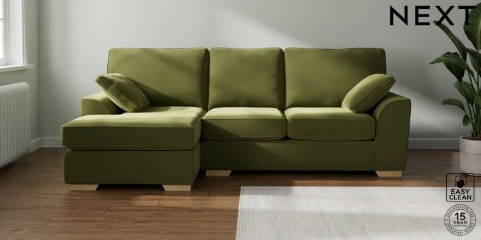 7.2.10 Buy Stamford Medium Sofa Chaise - Left Hand Plush Velvet Easy Clean Mid Olive Green Large Square Angle - Light from the Next UK online shop Click here to use our accessible website