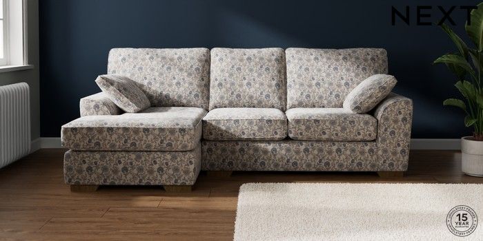 7.3.1 Buy Stamford Medium Sofa Chaise - Left Hand Relaxed Linen Look Print Woodblock Floral Blue Large Square Angle - Mid from the Next UK online shop Click here to use our accessible website