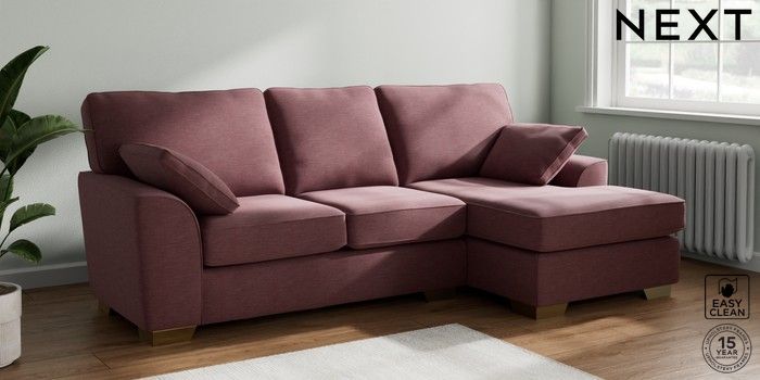 7.3.1 Buy Stamford Medium Sofa Chaise - Right Hand Fine Chenille Easy Clean Mid Mulberry Purple Large Square Angle - Brushed Brass from the Next UK online shop Click here to use our accessible website