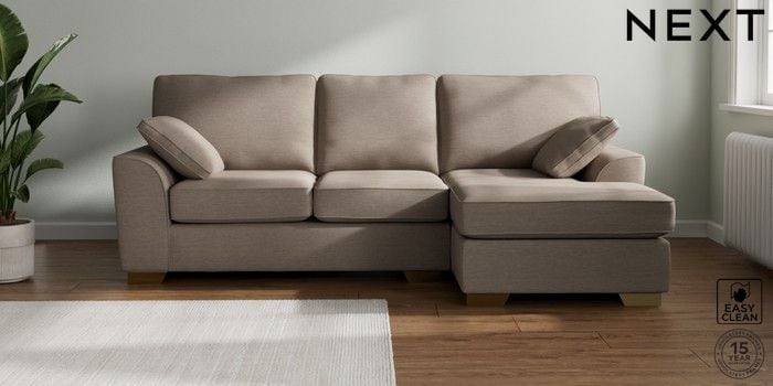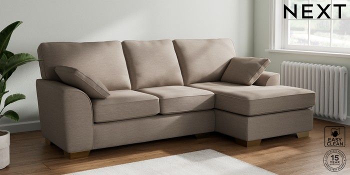 7.3.1 Buy Stamford Medium Sofa Chaise - Right Hand Fine Chenille Easy Clean Mid Taupe Brown Large Square Angle - Brushed Brass from the Next UK online shop Click here to use our accessible website