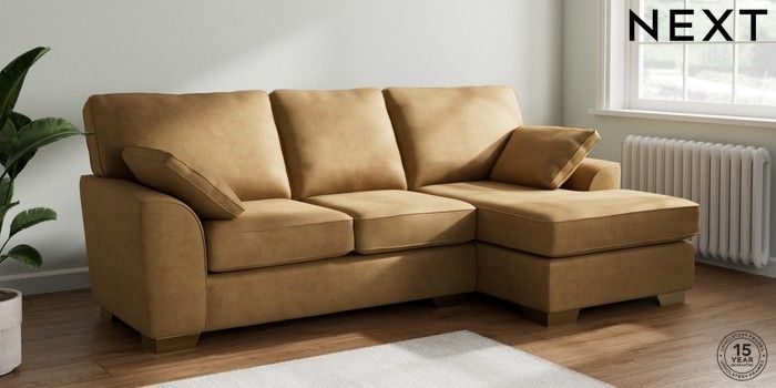 7.2.6 Buy Stamford Medium Sofa Chaise - Right Hand Luxe Chenille Honey Yellow Large Square Angle - Brushed Brass from the Next UK online shop Click here to use our accessible website