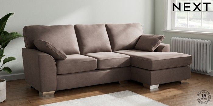 7.2.10 Buy Stamford Medium Sofa Chaise - Right Hand Luxe Chenille Mink Brown Large Square Angle - Chrome Metal from the Next UK online shop Click here to use our accessible website