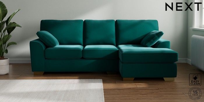 7.2.10 Buy Stamford Medium Sofa Chaise - Right Hand Plush Velvet Easy Clean Juniper Green Large Square Angle - Brushed Brass from the Next UK online shop Click here to use our accessible website