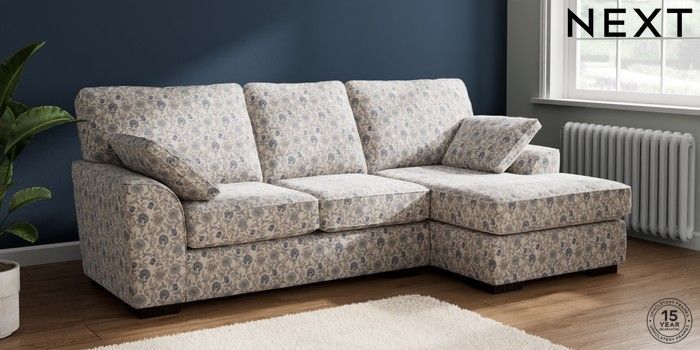 7.3.1 Buy Stamford Medium Sofa Chaise - Right Hand Relaxed Linen Look Print Woodblock Floral Blue Large Square Angle - Dark from the Next UK online shop Click here to use our accessible website