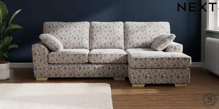 7.3.1 Buy Stamford Medium Sofa Chaise - Right Hand Relaxed Linen Look Print Woodblock Floral Blue Large Square Angle - Light from the Next UK online shop Click here to use our accessible website