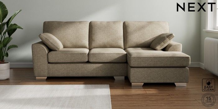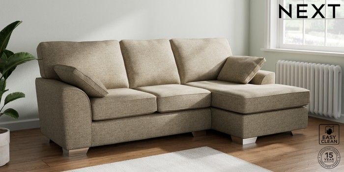 7.3.1 Buy Stamford Medium Sofa Chaise - Right Hand Woven Chenille Easy Clean Mid Natural Large Square Angle - Chrome Metal from the Next UK online shop Click here to use our accessible website