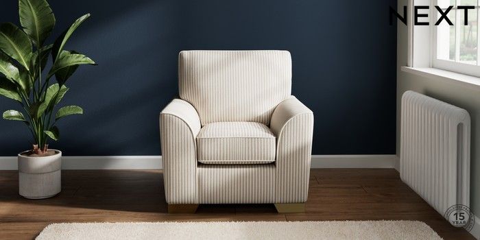 7.3.1 Buy Stamford Small Armchair Chenille Stripe Natural Square Angle - Brushed Brass from the Next UK online shop Click here to use our accessible website