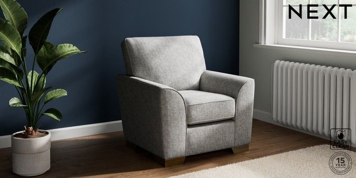 6.12.13 Buy Stamford Small Armchair Chunky Boucle Easy Clean Light Grey Square Angle - Brushed Brass from the Next UK online shop Click here to use our accessible website