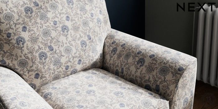 7.3.1 Buy Stamford Small Armchair Relaxed Linen Look Print Woodblock Floral Blue Square Angle - Brushed Brass from the Next UK online shop Click here to use our accessible website