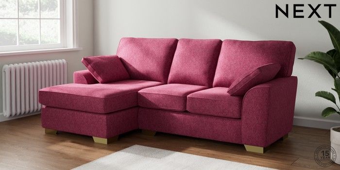 7.2.10 Buy Stamford Small Sofa Chaise - Left Hand Cotswold Chenille Dark Raspberry Pink Large Square Angle - Brushed Brass from the Next UK online shop Click here to use our accessible website