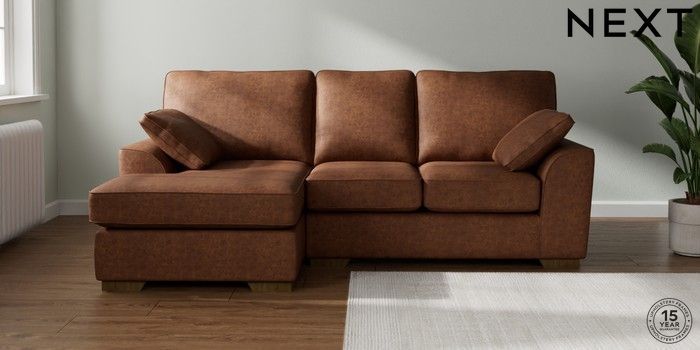 7.3.1 Buy Stamford Small Sofa Chaise - Left Hand Monza Faux Leather Easy Clean Chestnut Brown Large Square Angle - Mid from the Next UK online shop Click here to use our accessible website