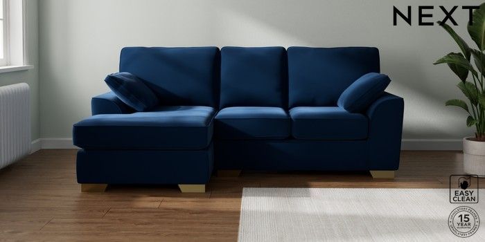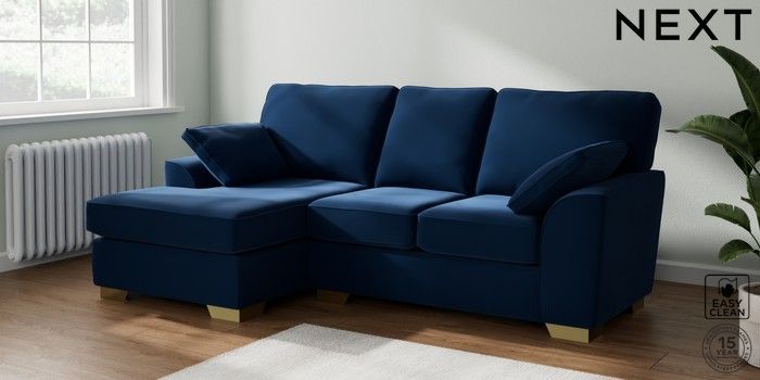7.3.1 Buy Stamford Small Sofa Chaise - Left Hand Plush Velvet Easy Clean Navy Blue Large Square Angle - Brushed Brass from the Next UK online shop Click here to use our accessible website