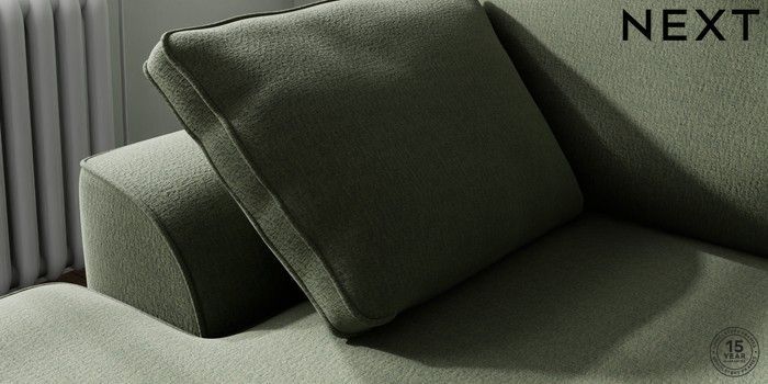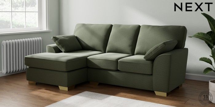 7.3.1 Buy Stamford Small Sofa Chaise - Left Hand Relaxed Linen Look Dark Green Large Square Angle - Brushed Brass from the Next UK online shop Click here to use our accessible website