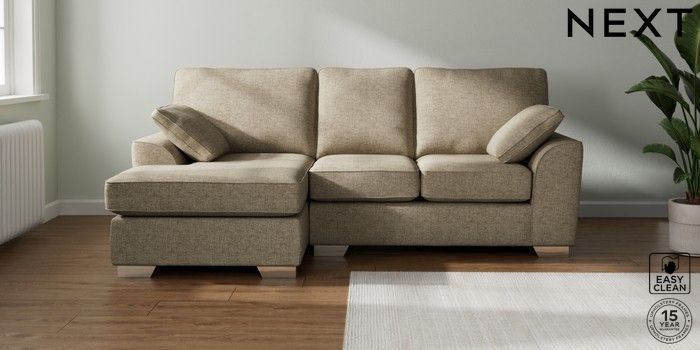 7.3.1 Buy Stamford Small Sofa Chaise - Left Hand Woven Chenille Easy Clean Mid Natural Large Square Angle - Chrome Metal from the Next UK online shop Click here to use our accessible website