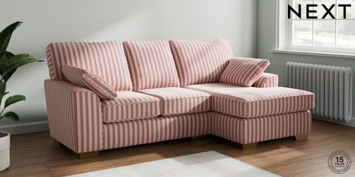 7.3.1 Buy Stamford Small Sofa Chaise - Right Hand Bold Chenille Stripe Dark Pink Large Square Angle - Brushed Brass from the Next UK online shop Click here to use our accessible website