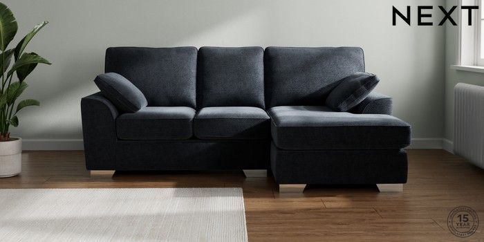 7.3.1 Buy Stamford Small Sofa Chaise - Right Hand Boucle Chenille Dark Slate Blue Large Square Angle - Chrome Metal from the Next UK online shop Click here to use our accessible website