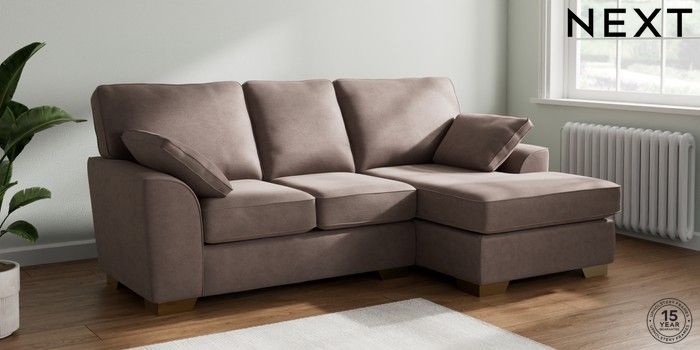 7.2.10 Buy Stamford Small Sofa Chaise - Right Hand Luxe Chenille Mink Brown Large Square Angle - Brushed Brass from the Next UK online shop Click here to use our accessible website