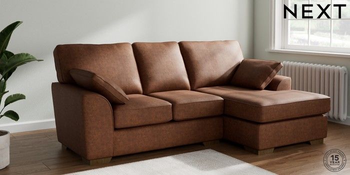 7.3.1 Buy Stamford Small Sofa Chaise - Right Hand Monza Faux Leather Easy Clean Chestnut Brown Large Square Angle - Mid from the Next UK online shop Click here to use our accessible website