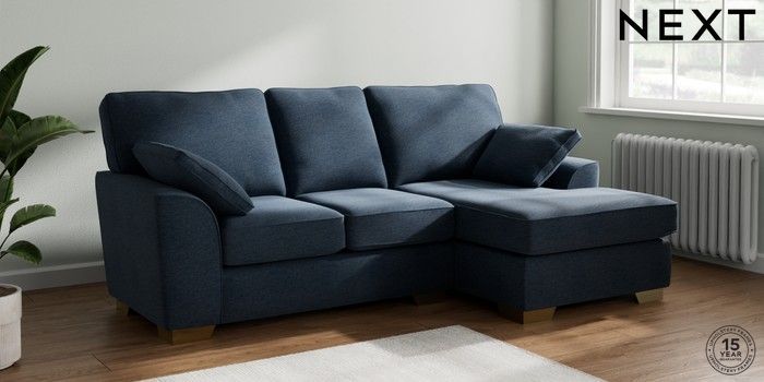 7.2.6 Buy Stamford Small Sofa Chaise - Right Hand Ripple Chenille Dark Blue Large Square Angle - Brushed Brass from the Next UK online shop Click here to use our accessible website