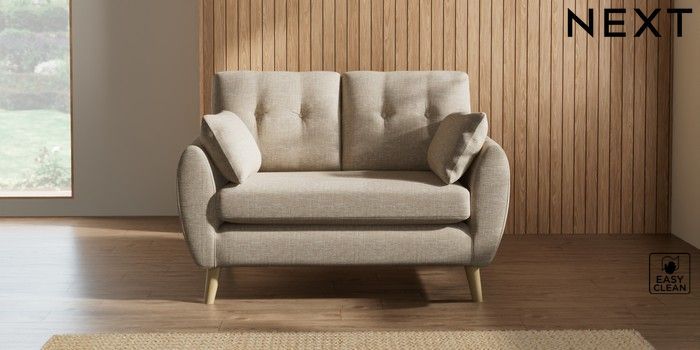 7.2.10 Buy Wilson Buttoned Back 2 Seater Small Sofa Boucle Weave Easy Clean Dark Natural Retro Tapered - Light from the Next UK online shop Click here to use our accessible website