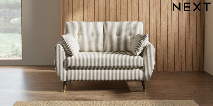 7.2.10 Buy Wilson Buttoned Back 2 Seater Small Sofa Chenille Stripe Moss Green Low Retro Tapered Metal Cap - Mid from the Next UK online shop Click here to use our accessible website