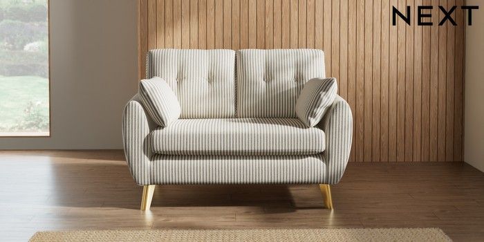 7.2.10 Buy Wilson Buttoned Back 2 Seater Small Sofa Chenille Stripe Moss Green Metal Tapered - Gold from the Next UK online shop Click here to use our accessible website