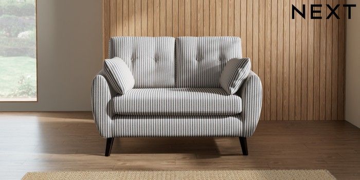 7.2.10 Buy Wilson Buttoned Back 2 Seater Small Sofa Chenille Stripe Slate Blue Retro Tapered - Dark from the Next UK online shop Click here to use our accessible website