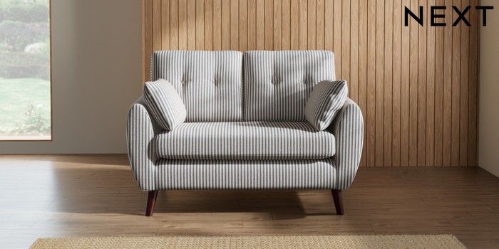 7.2.10 Buy Wilson Buttoned Back 2 Seater Small Sofa Chenille Stripe Slate Blue Retro Tapered - Dark Brown from the Next UK online shop Click here to use our accessible website