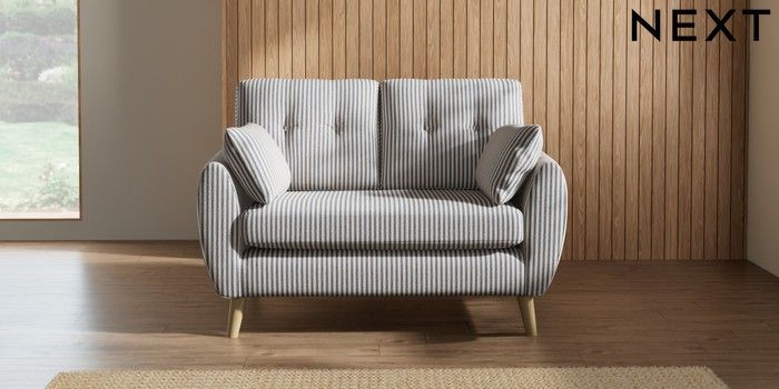 7.2.10 Buy Wilson Buttoned Back 2 Seater Small Sofa Chenille Stripe Slate Blue Retro Tapered - Light from the Next UK online shop Click here to use our accessible website
