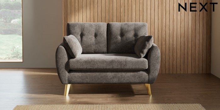 7.3.1 Buy Wilson Buttoned Back 2 Seater Small Sofa Chunky Chenille Mink Brown Metal Tapered - Gold from the Next UK online shop Click here to use our accessible website