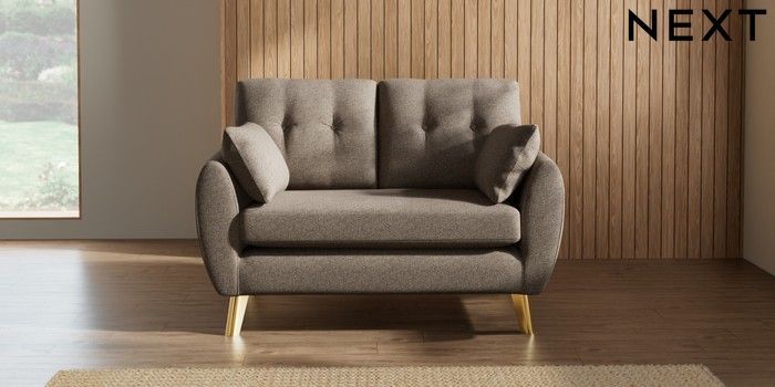 7.3.1 Buy Wilson Buttoned Back 2 Seater Small Sofa Chunky Weave Dark Natural Metal Tapered - Gold from the Next UK online shop Click here to use our accessible website