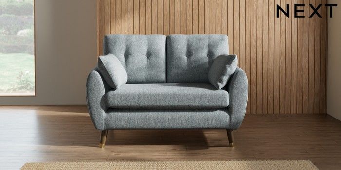 7.2.10 Buy Wilson Buttoned Back 2 Seater Small Sofa Chunky Weave Mid Blue Low Retro Tapered Metal Cap - Mid from the Next UK online shop Click here to use our accessible website