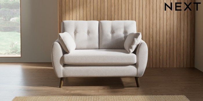 7.2.10 Buy Wilson Buttoned Back 2 Seater Small Sofa Cotswold Chenille Oyster Retro Tapered - Mid from the Next UK online shop Click here to use our accessible website