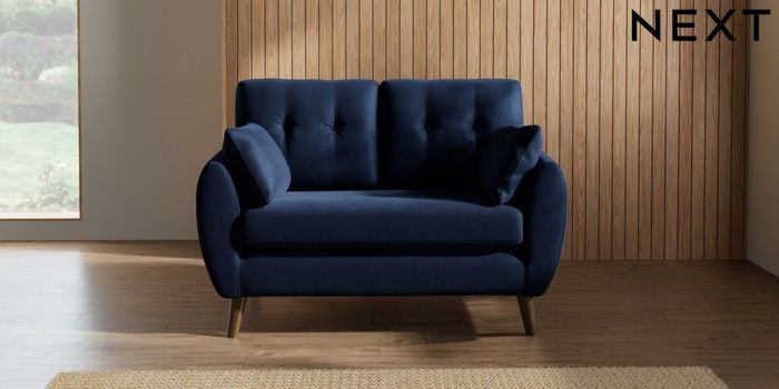 7.2.10 Buy Wilson Buttoned Back 2 Seater Small Sofa Luxe Chenille Navy Blue Retro Tapered - Mid from the Next UK online shop Click here to use our accessible website