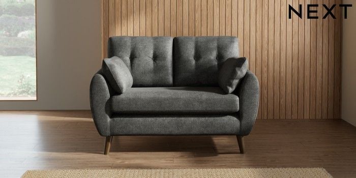 7.2.10 Buy Wilson Buttoned Back 2 Seater Small Sofa Plush Chenille Dark Grey Retro Tapered - Mid from the Next UK online shop Click here to use our accessible website