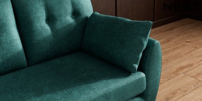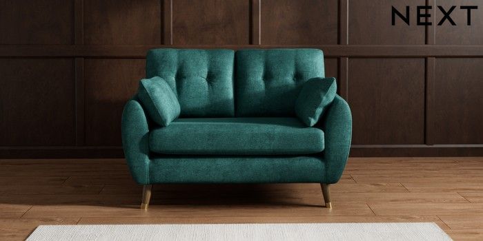 7.3.1 Buy Wilson Buttoned Back 2 Seater Small Sofa Plush Chenille Dark Teal Green Low Retro Tapered Metal Cap - Mid from the Next UK online shop Click here to use our accessible website