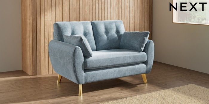 7.3.1 Buy Wilson Buttoned Back 2 Seater Small Sofa Plush Chenille Light Blue Metal Tapered - Gold from the Next UK online shop