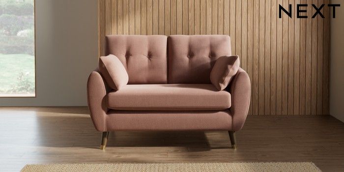 7.2.10 Buy Wilson Buttoned Back 2 Seater Small Sofa Relaxed Linen Look Light Rust Brown Low Retro Tapered Metal Cap - Mid from the Next UK online shop Click here to use our accessible website
