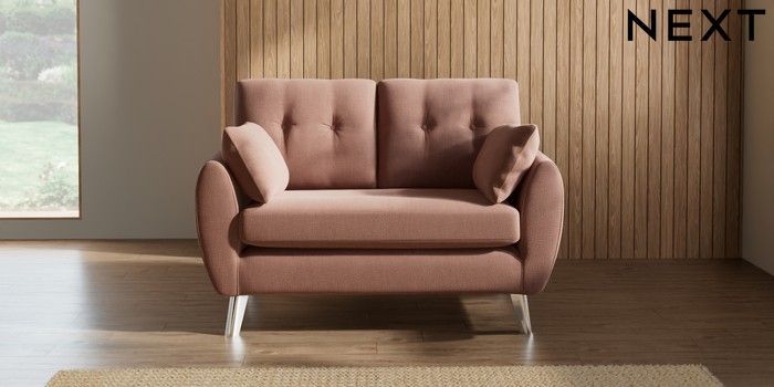 7.2.10 Buy Wilson Buttoned Back 2 Seater Small Sofa Relaxed Linen Look Light Rust Brown Metal Tapered - Chrome from the Next UK online shop Click here to use our accessible website