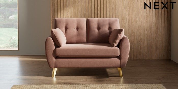 7.2.10 Buy Wilson Buttoned Back 2 Seater Small Sofa Relaxed Linen Look Light Rust Brown Metal Tapered - Gold from the Next UK online shop Click here to use our accessible website